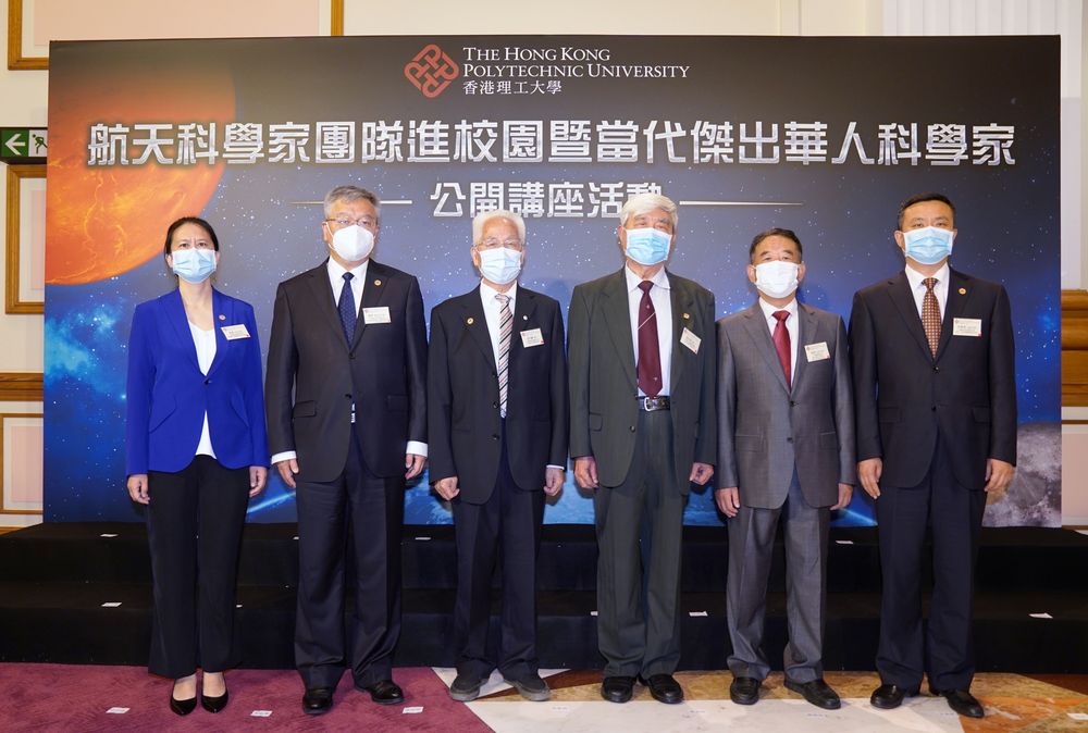 6月23日,在香港理工大学,6位航天专家(自左至右:张熇、谢军、龙乐豪、戚发轫、胡浩、孙泽洲)在讲座前留影。新华社记者 王申 摄