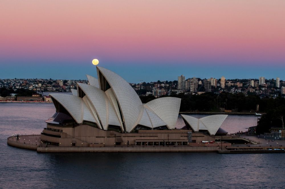 这是5月26日拍摄的澳大利亚悉尼歌剧院和刚刚升起的超级月亮。(新华社记者白雪飞摄)