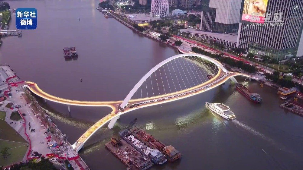 #珠江首座跨江人行桥开通#【猴赛雷!#漫步在如水袖似琴弦的跨江人行桥#】广州首座跨越珠江的人行桥将于6月25日开通。承建单位负责人介绍,桥的造型设计融入了粤曲水袖和岭南古琴等岭南文化元素,大桥主跨198米,为斜拱曲梁斜拉桥,紧邻广州“小蛮腰”和海心沙亚运公园,这座人行桥将成为珠江上的新地标。(记者田建川) 新华社的微博视频