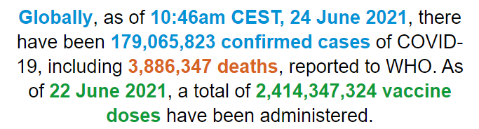根据世卫组织最新实时统计数据,截至欧洲中部夏令时间6月24日10时46分(北京时间6月24日16时46分),全球累计新冠肺炎确诊病例179065823例,累计死亡病例3886347例。