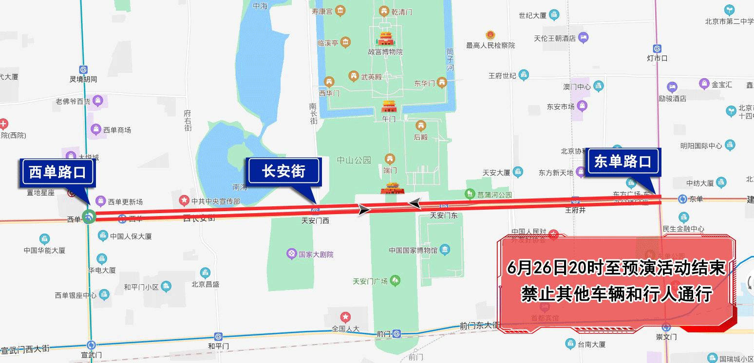 6月26日20时至预演活动结束,长安街由西单路口(不含)至东单路口双方向路段,除持有预演活动专用证件的车辆和人员外,禁止其他车辆和行人通行。