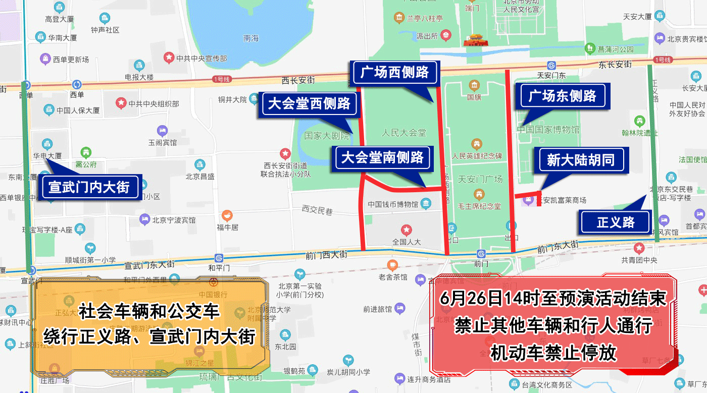 6月26日14时至预演活动结束,人民大会堂西侧路、人民大会堂南侧路、天安门广场东侧路、天安门广场西侧路、新大陆胡同,除持有预演活动专用证件的车辆和人员外,禁止其他车辆和行人通行,机动车禁止停放。社会车辆和公交车经正义路、宣武门内大街绕行。
