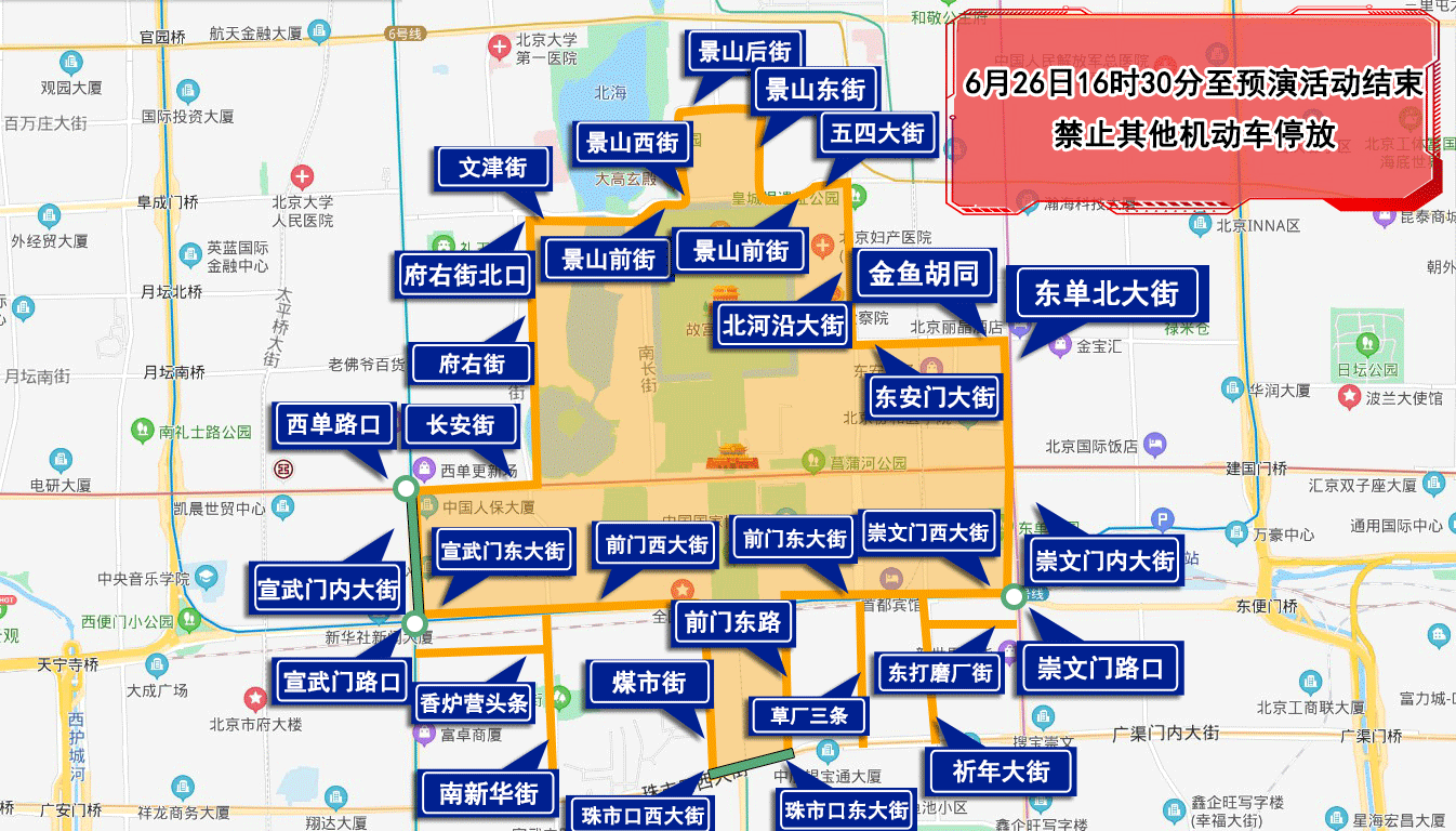 6月26日16时30分至预演活动结束,由府右街北口经府右街、长安街、西单路口(不含)、宣武门内大街(不含)、宣武门路口(不含)、宣武门东大街、前门西大街、煤市街、珠市口西大街(不含)、珠市口东大街(不含)、前门东路、前门东大街、崇文门西大街、崇文门路口(不含)、崇文门内大街、东单北大街、金鱼胡同、东安门大街、北河沿大街、五四大街、景山前街、景山东街、景山后街、景山西街、景山前街、文津街至府右街北口以内区域,祈年大街、东打磨厂街、南新华街、香炉营头条、草厂三条,除持有预演活动专用证件的车辆外,禁止其他机动车停放。