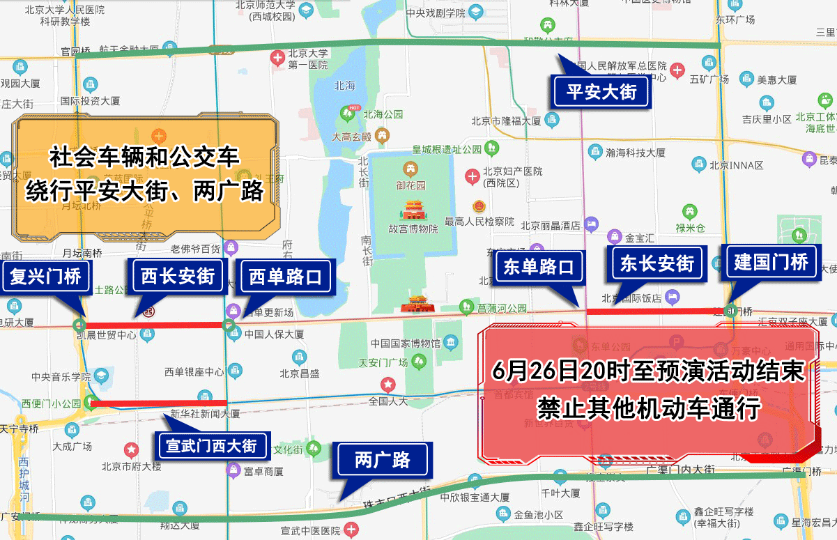 6月26日18时30分至预演活动结束,由府右街北口经府右街、长安街(不含)、西单路口(不含)、宣武门内大街(不含)、宣武门路口(不含)、宣武门东大街、前门西大街、煤市街、珠市口西大街(不含)、珠市口东大街(不含)、前门东路、前门东大街、崇文门西大街、崇文门路口(不含)、崇文门内大街、东单路口(不含)、东单北大街、金鱼胡同、东安门大街、北河沿大街、五四大街、景山前街、景山东街、景山后街、景山西街、景山前街、文津街至府右街北口以内区域(以上区域不含长安街)、祈年大街、东打磨厂街、南新华街、香炉营头条、草厂三条,除持有预演活动专用证件的车辆和人员外,禁止其他车辆和行人通行。社会车辆和公交车经宣武门内大街、平安大街、两广路绕行。