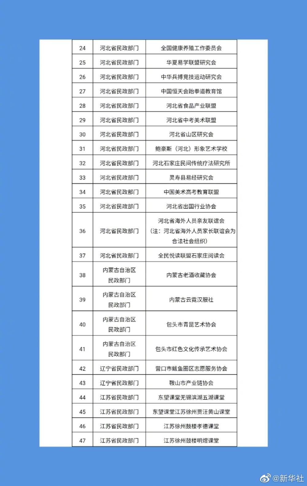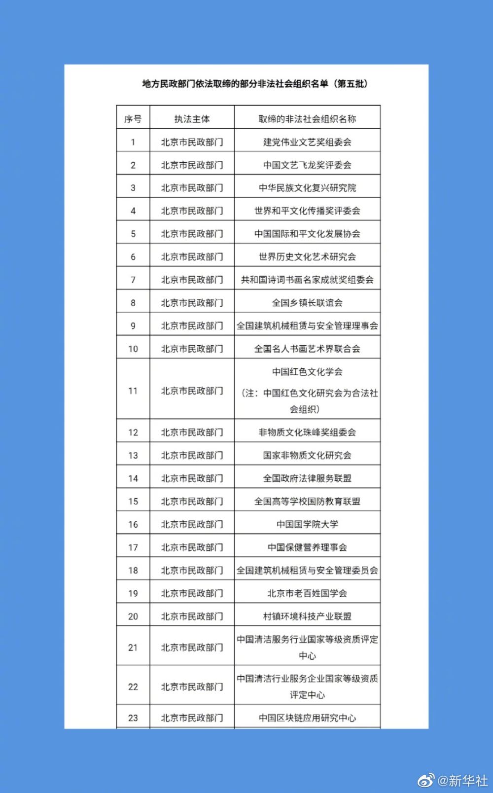 【汇总名单第五批!这80家非法社会组织已取缔,遇到请报警!】民政部25日公布第五批地方民政部门近年来依法取缔的部分非法社会组织名单,共80家。民政部提示,社会公众如果发现名单中的非法社会组织仍在开展活动的,可依法向公安机关报案。同时,提醒有关机构和社会公众,在与社会组织开展合作或参与其活动时,请通过“中国社会组织政务服务平台”(www.chinanpo.gov.cn)、“中国社会组织动态”政务微信(微信号:chinanpogov)核实其身份,避免上当受骗;也欢迎社会各界通过“中国社会组织政务服务平台”提供涉嫌非法社会组织活动线索。(记者高蕾)