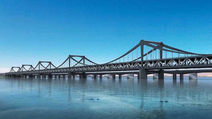 钱塘江新建大桥,是国内首座多跨长联公轨两用桥,上层为八车道高速公路,下层为双线轻轨。大桥全长1348米、主跨240米。桥梁造型提取钱塘江“江潮浪花”的元素,桥梁外观与钱塘江融为一体,将展现出“奔竞不息、勇立潮头”的新时代钱塘江精神。(总台记者 高珧)