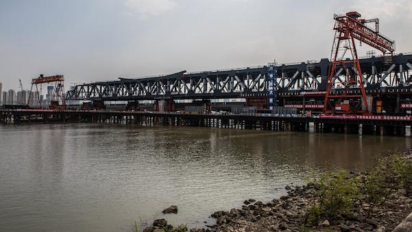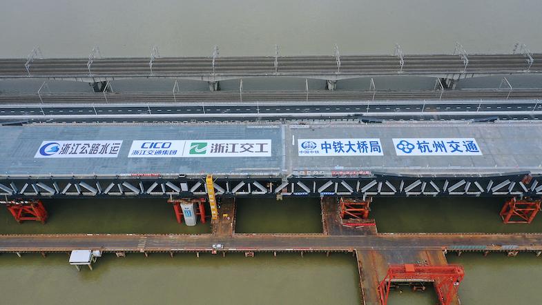 这就是钱塘江上新建的大桥,也是横跨钱塘江的第11座大桥,在28台步履机和8台竖向千斤顶的作用下,经过72个小时的连续作业,大桥钢桁梁逐渐合龙。