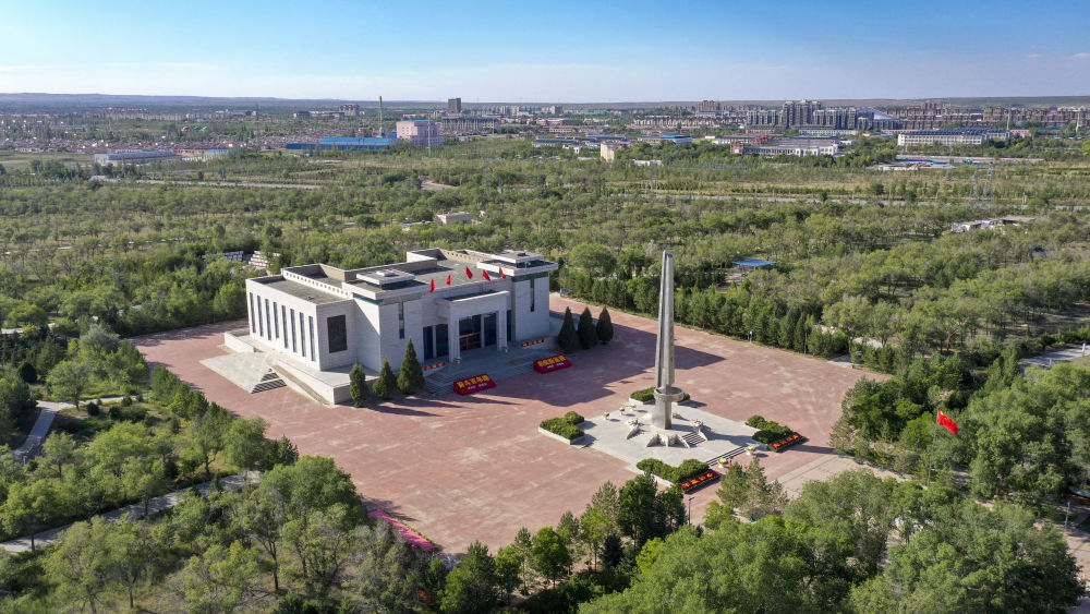 ↑ 4月15日,宁夏盐池县革命烈士纪念馆讲解员(左一)为前来参观的游客介绍毛泽民在盐池县的故事。