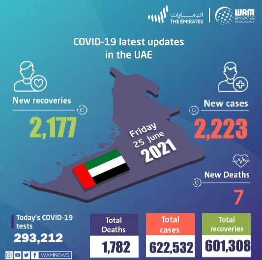 阿联酋卫生与预防部于当地时间6月25日公布,阿联酋当日新增新冠肺炎确诊病例2223例,累计确诊622532例;新增治愈病例2177例,累计治愈601308例;新增死亡病例7例,累计死亡1782例。