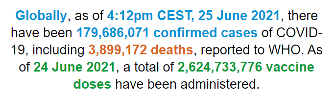 根据世卫组织最新实时统计数据,截至欧洲中部夏令时间6月25日16时12分(北京时间6月25日22时12分),全球累计新冠肺炎确诊病例179686071例,累计死亡病例3899172例。6月25日全球新冠肺炎确诊病例新增437764例,死亡病例新增9218例。(总台记者 朱赫)