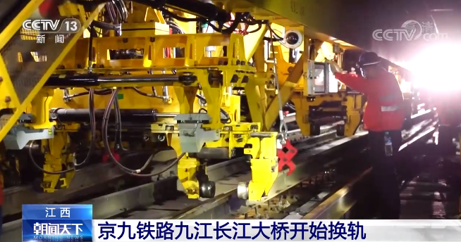 19时20分,一列无缝钢轨快速换轨车在铁路工人的辅助下,开始对京九铁路九江长江大桥进行钢轨更换作业。在工人们的操作下,换轨车用机械手臂代替了以往人工使用撬棍,对钢轨进行拨、提、移等操作,工作效率提高了近一倍。