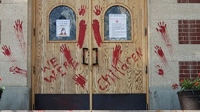 与此同时,加拿大出现了针对天主教会的仇恨行为。在萨斯喀彻温的城市萨斯卡通,当地时间6月24日下午,在位于市中心的罗马天主教圣保罗教堂的大门上,有人用油漆拍出手印,并涂些了诸如“我们是孩子”之类的文字,表示对天主教会的愤怒。(总台记者 张森)