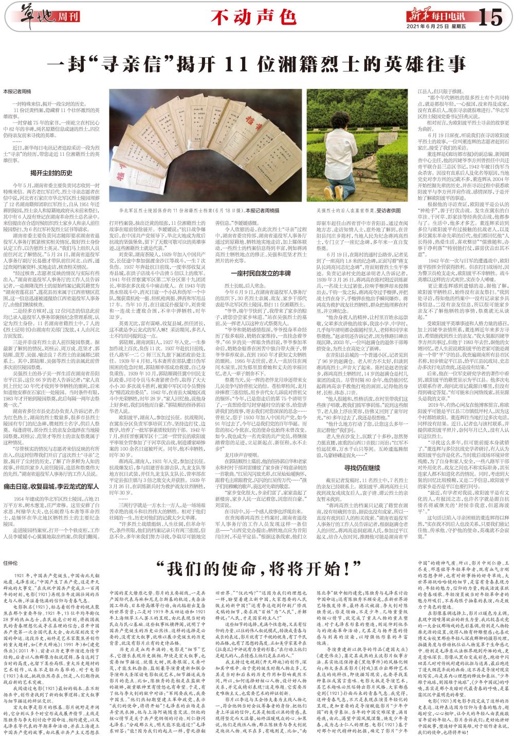 一封穿越75年的家书,一座屹立在村民心中82年的丰碑,两名原籍信息成谜的烈士,四位仍待亲友前来寻找的英雄。近日,新华每日电讯记者追踪采访一段为烈士“寻亲”的经历,带您走近11位湘籍烈士的英雄往事。