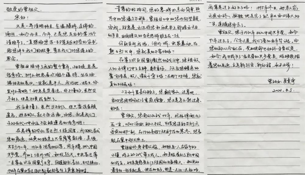 祭奠当天,吴一挥的老伴龙月珍还带来女儿吴竞争写给曾祖父的信。苍松翠柏间,龙月珍捧着三张信纸,用乡音代女儿诉说对曾祖父的缅怀:“今年,已是您走后的第75个清明节了,一直想给您写封穿越时空的家书,给您讲讲我们的故事,寄去我们对您深深的思念……曾祖父,您于1930年加入中国共产党,如今91年过去了,今年已是我们党的百年华诞。而您的初心今犹在,党的使命也始终未曾改变。如今,我也成为一名光荣的共产党员,将继续踏着您的足迹,立足新起点、新征程,永不止步!”