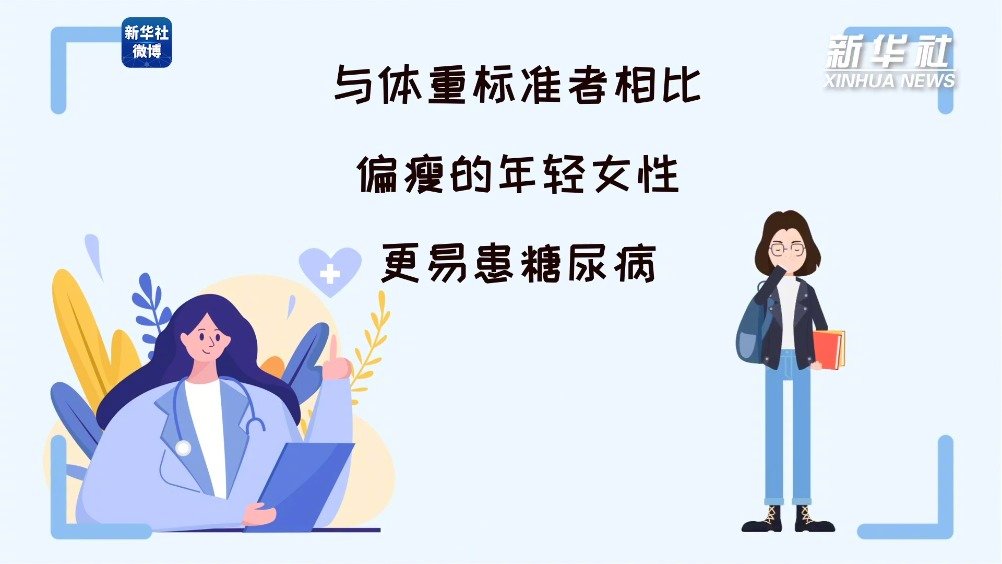 【研究称#过瘦年轻女性需警惕糖尿病#】近日,有专家研究发现,与体重标准者相比,偏瘦的年轻女性更易患糖尿病。原因在于她们之中很多人的餐后血糖值一直居高不下。而餐后血糖值一直较高的女性,存在胰岛素分泌不足的问题。戳视频,了解详情↓关注#糖尿病人三条饮食纪律# 新华社的微博视频