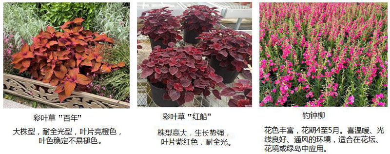 主景:红旗采用卡盆工艺,人物采用玻璃钢工艺结合穴盘苗插植工艺,展现出人们幸福安康的美好生活场景。花坛集中应用大量一、二年生花卉新品种:矮牵牛、美女樱、草海桐及宿根花卉新品种:滨菊、吊钟柳等品种;丰富的园艺品种呈现出园林园艺发展成果与人民共享的美好画面;主打宿根花卉钓钟柳。花坛中首次应用两个命名为“红船”和“百年”的彩叶草自育新品种,向党的百年华诞献礼。