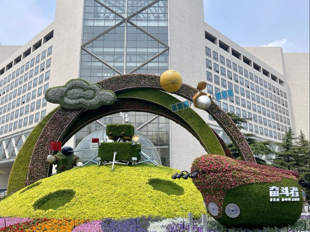 含义:花坛以嫦娥五号月球探测器、天问一号火星探测器、奋斗者号潜水器、载人航天等为题材,展现了创新发展、科技兴国的辉煌成就。