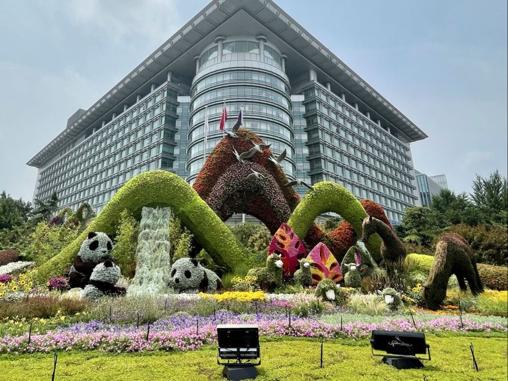 含义:花坛以鸟巢(2008年北京奥运会)、冰丝带(2022年北京冬奥会)、世界地图为主景,配以冬奥会吉祥物以及我国举办或参与的重大国际活动标识,体现在党的正确领导下,伟大的祖国阔步走向世界。