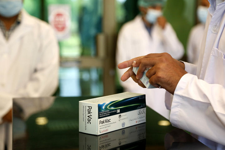 6月1日,在巴基斯坦伊斯兰堡,工作人员展示本地灌装生产的中国康希诺新冠疫苗。新华社发(艾哈迈德·卡迈勒摄)
