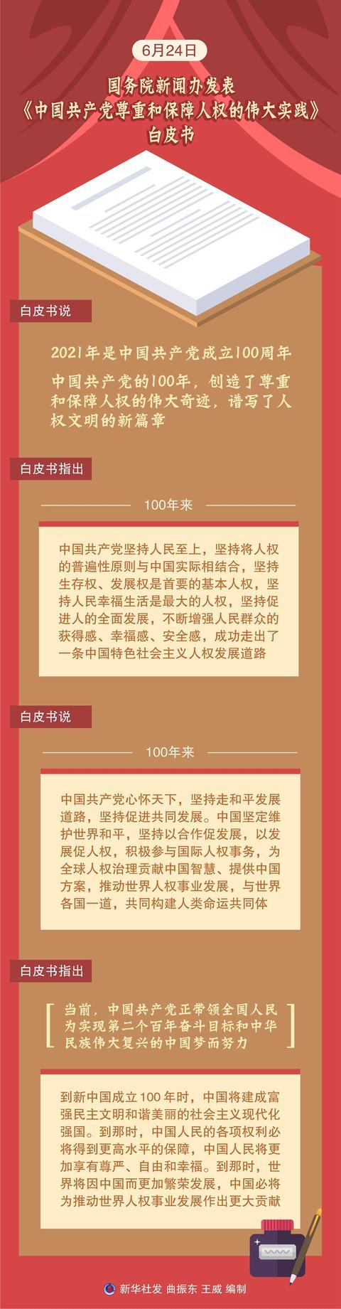 国务院新闻办24日发表《中国共产党尊重和保障人权的伟大实践》白皮书。透过白皮书,我们看到一个政党牢记初心使命,为人民解放和幸福而奋斗的艰辛历程;看到一个政党将人权的普遍性原则与中国实际相结合,成功走出一条中国特色社会主义人权发展道路的不懈求索。