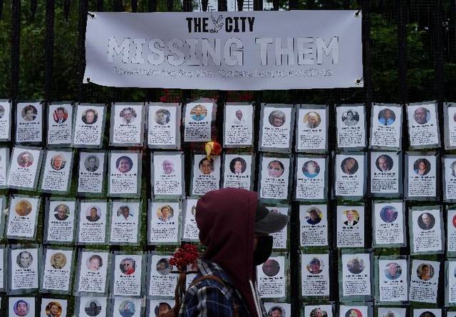 6月14日,行人从美国纽约一处墓地外为新冠死者设立的纪念装置旁走过。(新华社记者王迎摄)