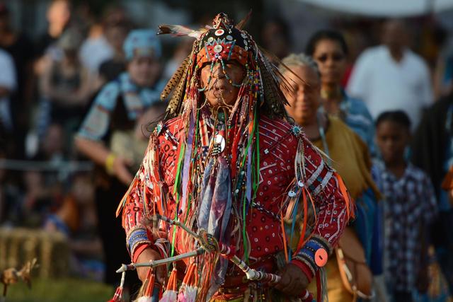 2013年7月27日,一名身着传统装束的印第安人在美国纽约举行的“帕瓦仪式”上表演舞蹈。(新华社记者王雷摄)