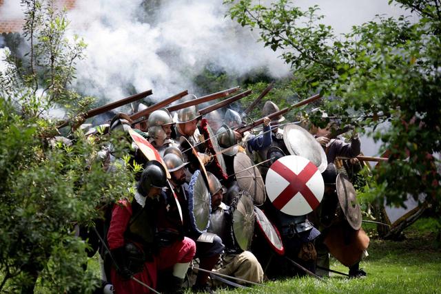 2007年5月11日,在美国弗吉尼亚州詹姆斯敦殖民定居点旧址,一些全副武装的演员正在重现当年殖民地士兵与印第安人战斗的场景。(新华社记者侯俊摄)
