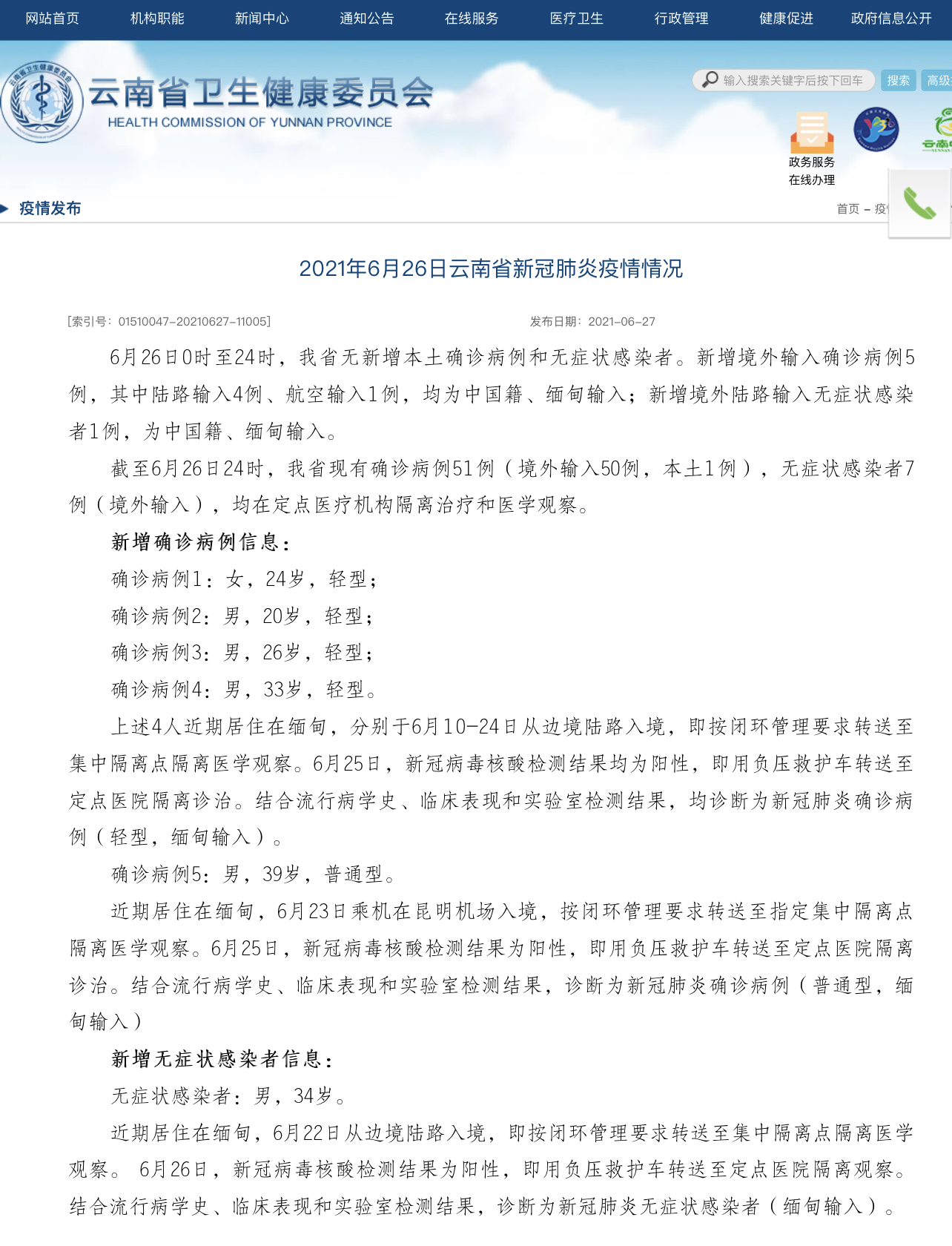 6月26日0时至24时,云南省无新增本土确诊病例和无症状感染者。新增境外输入确诊病例5例,其中陆路输入4例、航空输入1例,均为中国籍、缅甸输入;新增境外陆路输入无症状感染者1例,为中国籍、缅甸输入。