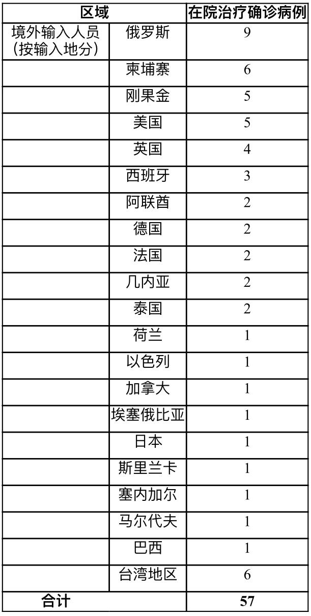 截至2021年6月26日24时,累计境外输入确诊病例1829例,出院1772例,在院治疗57例。现有待排查的疑似病例0例。