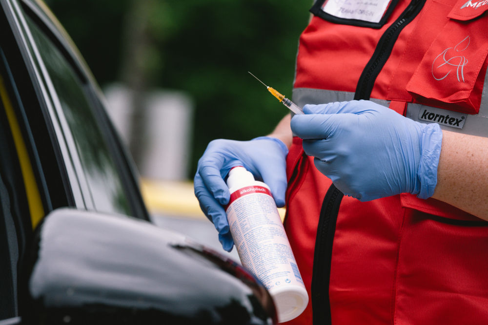 6月5日,德国梅尔布施的工作人员在一处“得来速”式新冠疫苗接种点工作。(新华社发,唐颖摄)