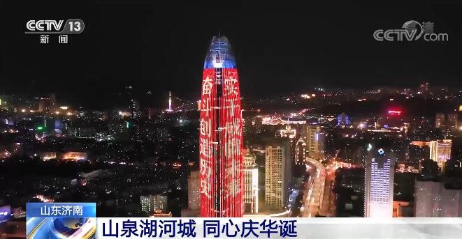这里是总高度303米的济南绿地中心。高耸的楼体上,“奋斗创造历史,实干成就未来!”“奋斗百年路,启航新征程”“没有共产党就没有新中国!”标语闪耀夜空。