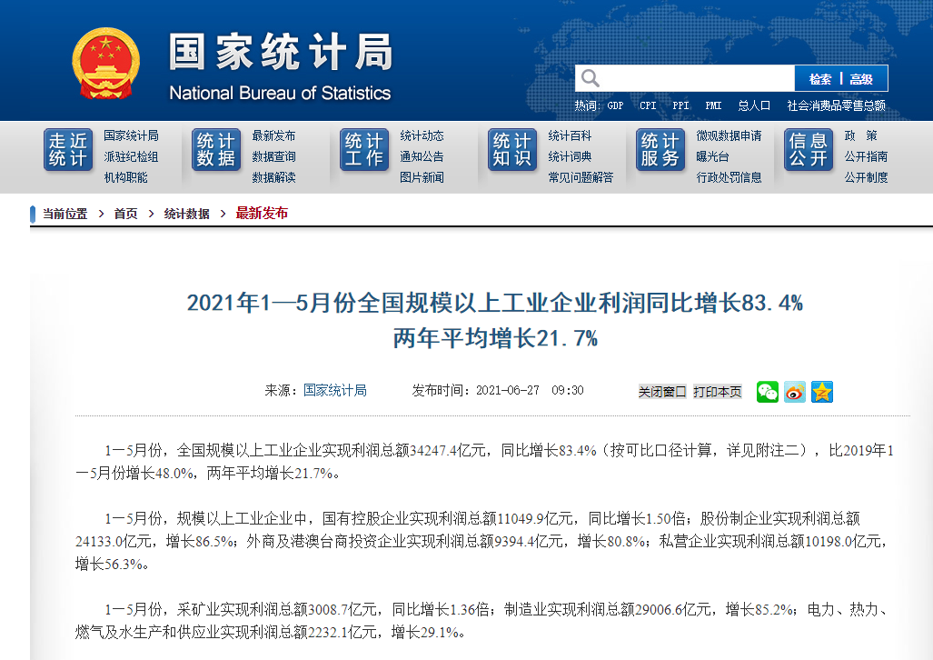 国家统计局今天公布数据显示,1—5月份,全国规模以上工业企业实现利润总额34247.4亿元,同比增长83.4%,比2019年1—5月份增长48.0%,两年平均增长21.7%。