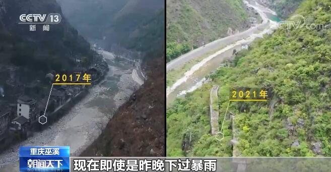 总台记者 王磊:四年以后,我再次回到宁厂古镇,发现这里的变化让人震撼。记得当年我就是爬上身后这座石头山见证了林云喜他们种树的艰辛,功夫不负有心人,现在我们可以看到山体上包裹上了一层毛茸茸的绿色。在山脚下就是长江的一级支流大宁河,记得以前有很多泥沙,现在即使是昨晚刚下过暴雨,河水仍然是很清澈的。