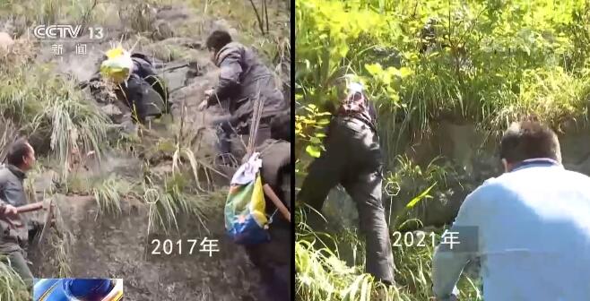 总台记者 王磊:当时爬上来的时候特别害怕,因为下面是悬崖。确实是植物比以前多了很多,我看这些植物都可以用手扶着,确实比上次轻松了很多。