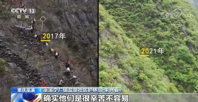 这是2017年记者在重庆巫溪宁厂古镇记录下的场景。为了在这片已经荒漠化的石头山上种树,官山林场工班长林云喜和工友们肩背手提,先是把水泥、石块、泥土运上峭壁筑成一个个石窝子,再把树苗一棵棵背上山,种在石窝子里。