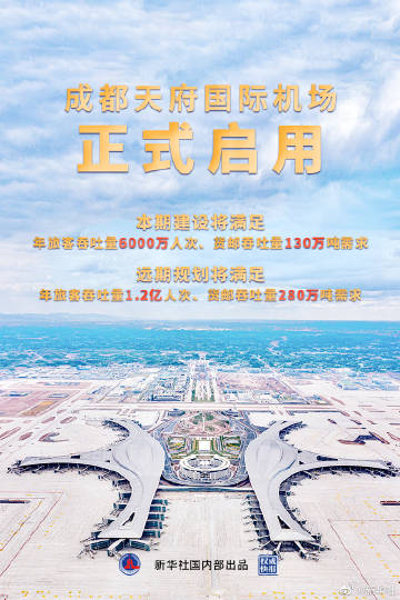 【#权威快报#|看!#成都天府国际机场启用#】27日成都天府国际机场正式启用,这是国家“十三五”期间规划建设的最大民用运输枢纽机场。成都天府国际机场本期建设将满足年旅客吞吐量6000万人次、货邮吞吐量130万吨需求,远期规划将满足年旅客吞吐量1.2亿人次、货邮吞吐量280万吨需求,为成渝地区双城经济圈建设注入新的动力。(记者江毅、谢佼、李倩薇;摄影刘坤;海报设计杨轶群)