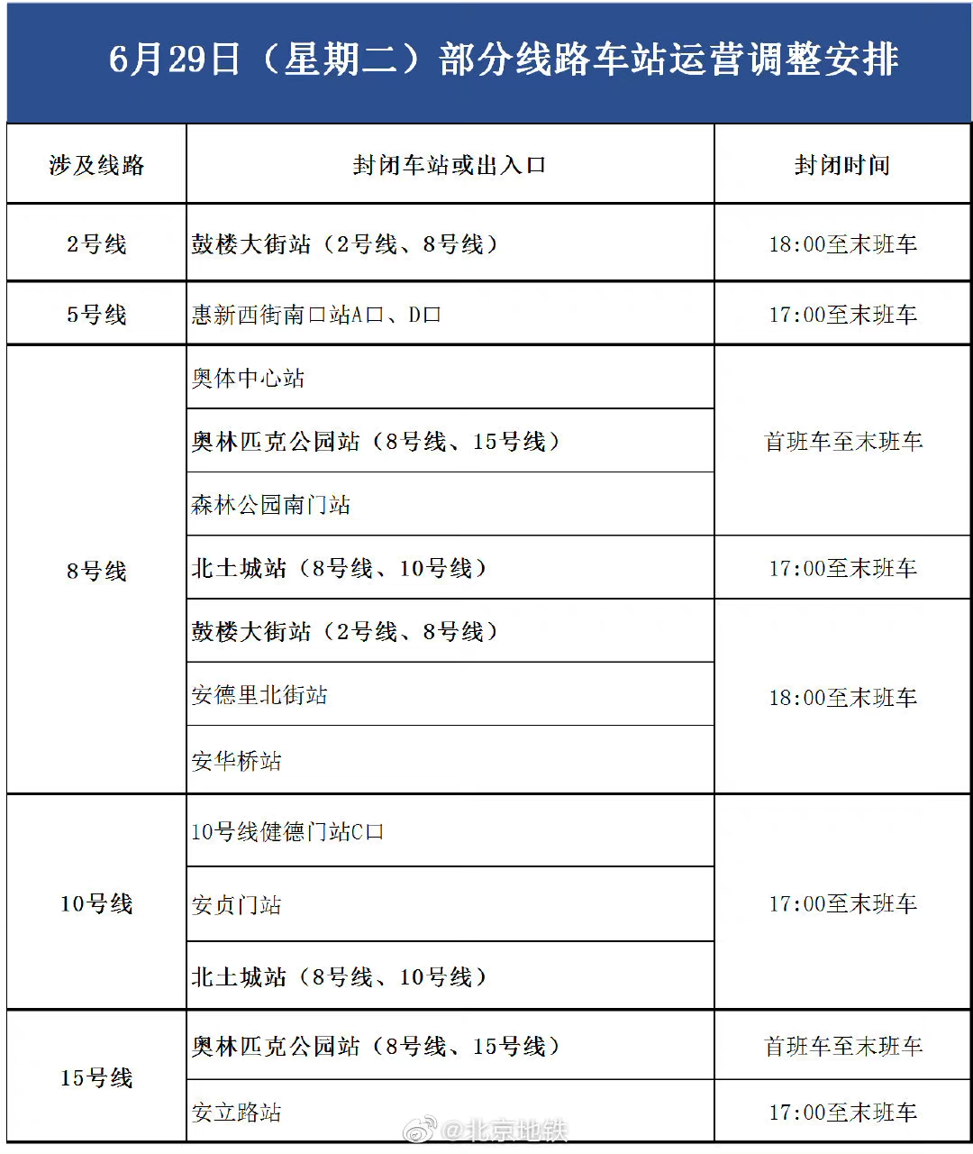 6月29日17:00至末班车,8号线北土城站、10号线安贞门站、北土城站,以及15号线安立路站封闭,各次列车在上述车站通过不停车。北土城站停止8号线和10号线之间的换乘。17:00至末班车,5号线惠新西街南口站A口、D口及10号线健德门站C口封闭,乘客可从其他出入口进出站。18:00至末班车,2号线鼓楼大街站、8号线鼓楼大街站、安德里北街站、安华桥站封闭,各次列车在上述车站通过不停车,鼓楼大街站停止2号线和8号线之间的换乘。