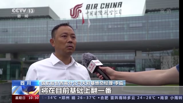 国航股份西南分公司天府基地总经理 李应:从地理意义上看,成都是连接欧洲和东南亚、澳洲的最佳枢纽航点选择。到2025年,国航在成都市场运力投放将在目前基础上翻一番,投入飞机超过160架,客货运输能力将大幅提升。