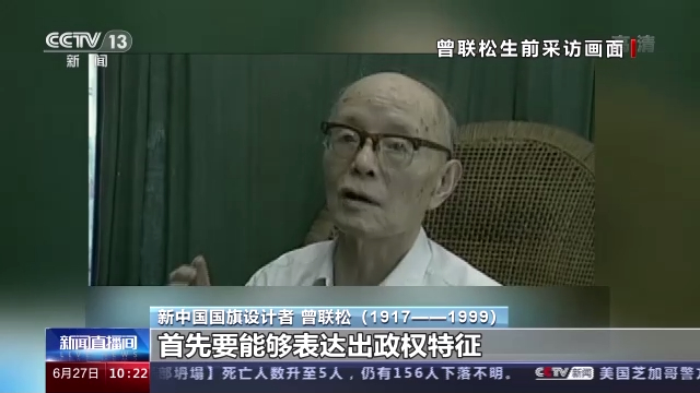 新中国国旗设计者 曾联松(1917—1999)(生前采访画面):首先要能够表达出政权特征,因为没有中国共产党就没有新中国,所以一定要表示共产党的领导,因此在国旗里确定了一颗大星代表中国共产党。但中国共产党领导广大人民怎么表达呢?四颗小星表示广大人民。