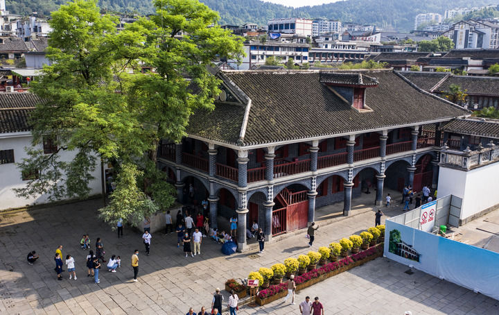 遵义会议会址旁的刺槐树枝繁叶茂(5月3日摄,无人机照片)。 新华社记者 陶亮 摄