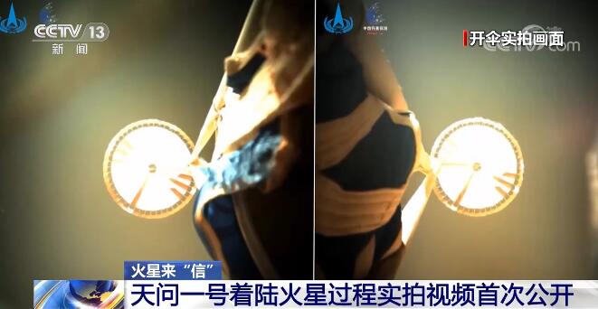 火星来“信”,先看一段视频。5月15日,天问一号着陆巡视器成功着陆火星,携带的开伞过程监视相机、落火状态监视相机、避障相机记录了降落伞弹伞、开伞和抛伞,动力减速和避障等过程。视频显示,着巡组合体进入火星大气层后,采用降落伞进行减速。当着巡组合体的速度和姿态都稳定之后,着巡组合体背罩和降落伞一起分离,通过发动机进行再一次的减速,随后组合体成功在火星表面软着陆。