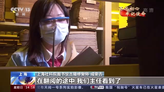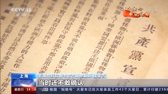 上海社科院图书馆古籍修复师 成雯吉:它之前是放在我们民国书架上,在翻阅的过程中,我们主任翻出来了这本首版的《共产党宣言》,当时还不敢确认。经过文献查阅,最后才确认这个是首版的《共产党宣言》,也是比较难得的,我们也很激动。