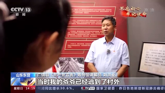 广饶县《共产党宣言》陈列馆讲解员 刘洪业:1945年的1月28日、29日两天,日伪军来我村扫荡。当时我的爷爷已经逃到了村外,但是回头看到村内房屋冒起了浓烟大火,他惦记这本《共产党宣言》,因为这本《共产党宣言》藏在了屋山头的雀眼里,他又冒险潜回村内,从烈火中把这本《共产党宣言》抢救下来。