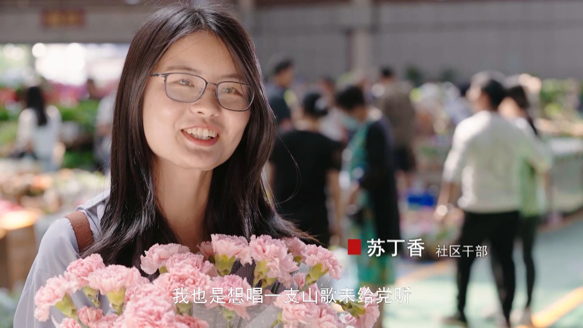 社区干部 苏丁香:今年不是共产党成立一百周年吗?我觉得我自己也是想唱一支山歌来给党听,然后也想把这一束康乃馨送给我们伟大的党。祝我们的党生日快乐,也祝愿我们的祖国繁荣昌盛。