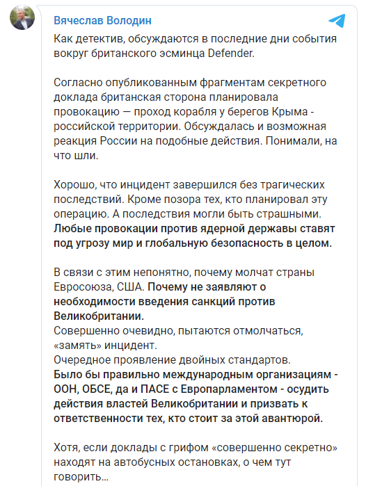当地时间6月27日,俄罗斯国家杜马(议会下院)主席沃洛金在其社交主页评论英国驱逐舰事件,称任何对核大国的挑衅都会对和平与全球安全造成威胁。