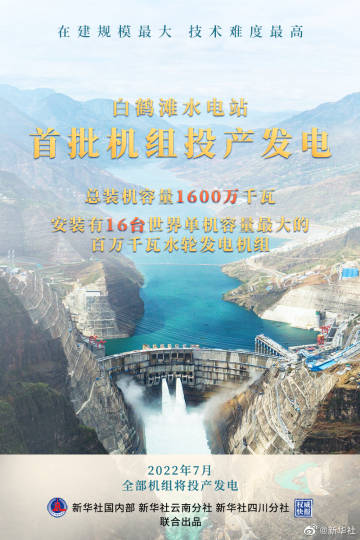 【#权威快报#|#白鹤滩水电站首批机组投产发电#】6月28日,白鹤滩水电站首批机组正式投产发电,标志着我国大型水电工程建设完成从“中国制造”到“中国创造”的历史性跨越。白鹤滩水电站位于云南省巧家县和四川省宁南县交界的金沙江干流上,是当今世界在建规模最大、技术难度最高的水电工程,总装机容量1600万千瓦,安装有16台世界单机容量最大的百万千瓦水轮发电机组,均由我国自主研制。白鹤滩水电站是实施“西电东送”的国家重大工程,将于2022年7月全部投产发电,与三峡、葛洲坝,以及金沙江乌东德、溪洛渡、向家坝水电站一起,构成世界最大的清洁能源走廊。(记者侯雪静、丁怡全、卢宥伊,海报设计杨轶群)