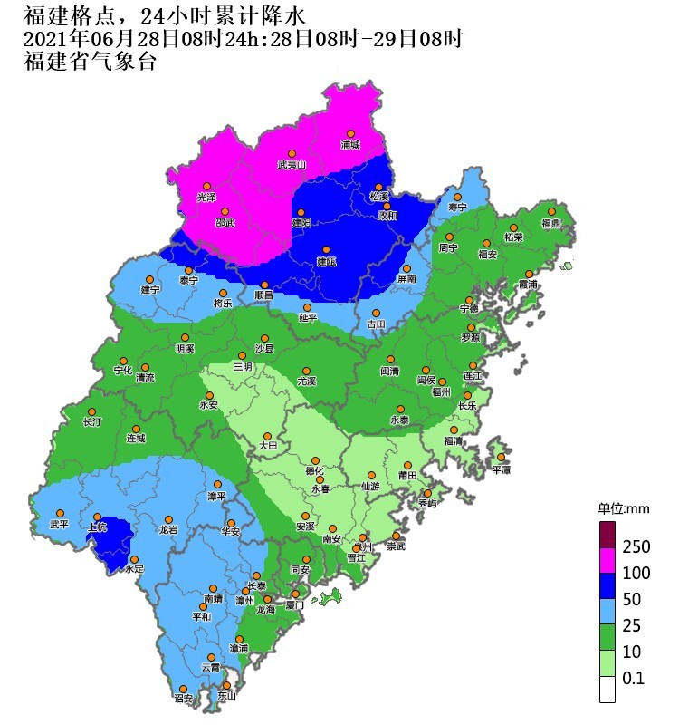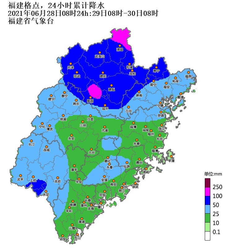 据福建省气象局首席预报员黄美金介绍,受切变南侧西南风急流影响,新一轮强降水集中“落户”闽北地区。黄美金表示,此次主要降水时段集中在6月28~30日,降水影响范围集中,降水落区有重叠,雷雨时局地伴有短时强降水和7~9级大风等强对流天气。