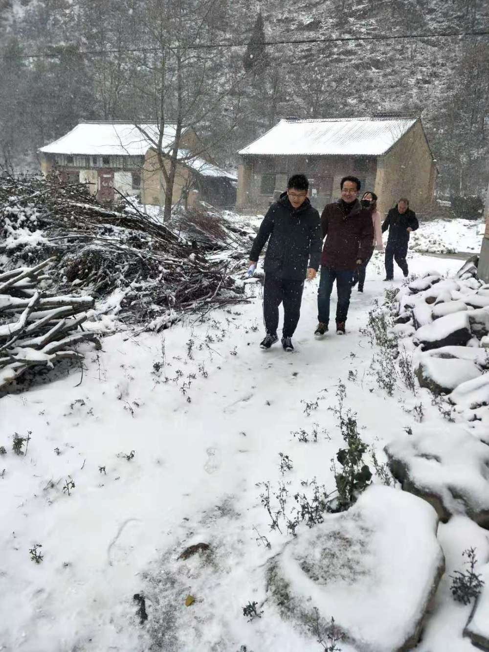陆星(左一)下雪期间入户解决贫困户家中困难。(受访者供图)
