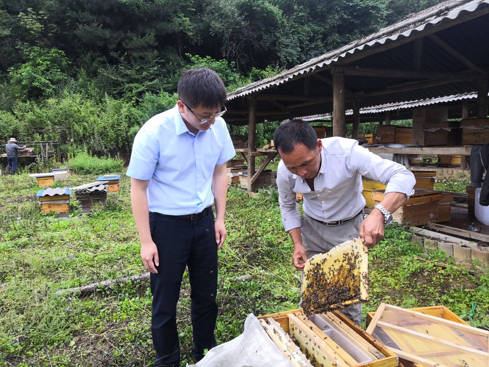 陆星(左一)考察村养蜂场生产和经营情况。新华社记者 吴鸿波 摄