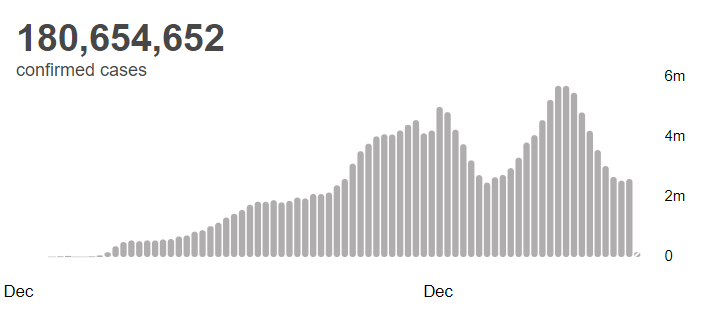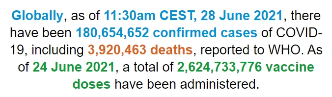 根据世卫组织最新实时统计数据,截至欧洲中部夏令时间6月28日11时30分(北京时间6月28日17时30分),全球累计新冠肺炎确诊病例180654652例,累计死亡病例3920463例。(总台记者 朱赫)